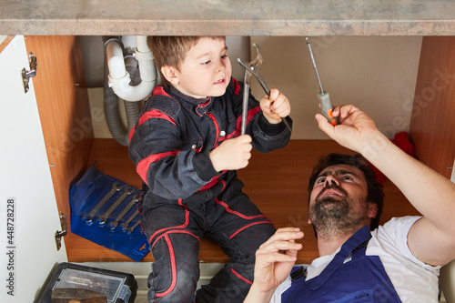 Father and son repair the broken sink