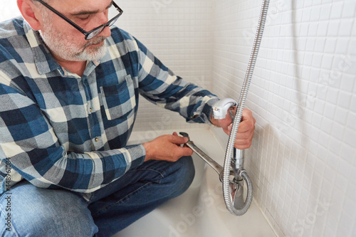 Klempner mit Schraubenschlüssel montiert Brauseschlauch
