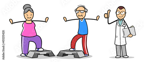 Arzt mit Paar Senioren bei Aerobic mit Steppbrett im Sportverein
