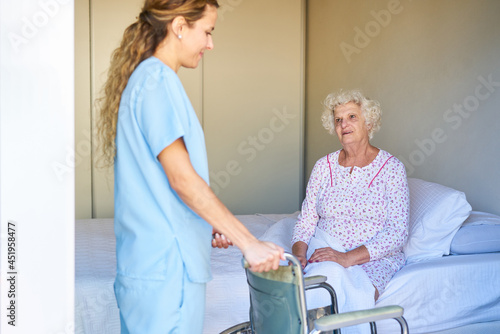 Pflegehilfe bringt Rollstuhl ans Bett einer behinderten Seniorin