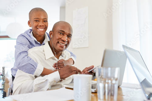 Lächelnder Junge stört Vater beim Videochat im Homeoffice