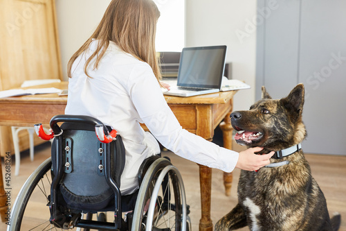 Woman in wheelchair with assistance dog at desk at home