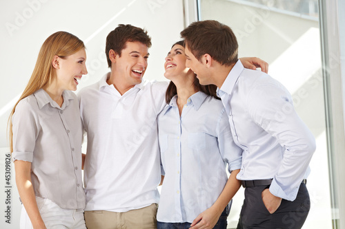 Confident senior businessman standing behind colleagues discussing over blank sticky notes during meeting in office