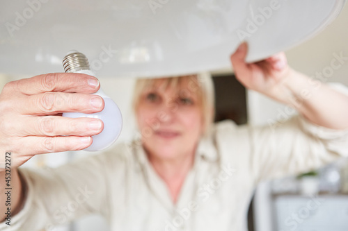 Frau wechselt LED Glühbirne in Lampe zum Energiesparen