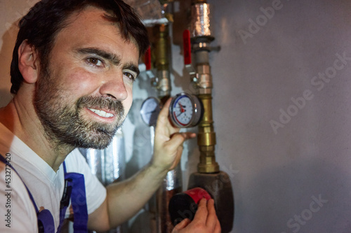 Installateur prüft Wasserdruck der Heizungsinstallation