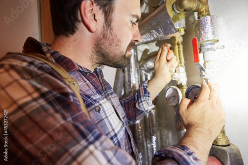 Heating fitter checks the water pipe on the heating system