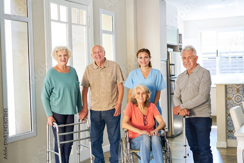 Group of seniors with wheelchairs and walking frames in the retirement home