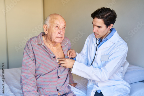 Zufriedener Senior im Rollstuhl betreut vom Sohn