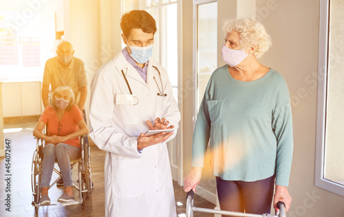 Doctor with tablet computer and seniors in Covid-19 pandemic