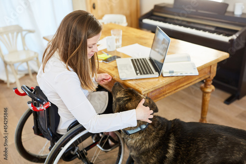 Frau im Rollstuhl am Computer krault ihren Assistenzhund