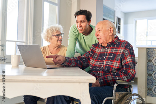 Zufriedener Senior im Rollstuhl betreut vom Sohn