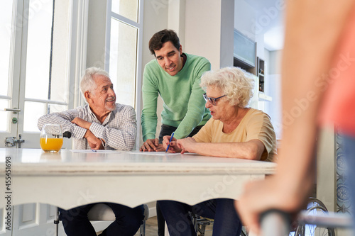 Junger Mann hilft Senioren mit Demenz beim Rätsel lösen