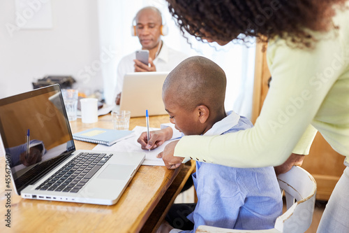 Frau im Rollstuhl bei Videokonferenz zu Hause mit Kind
