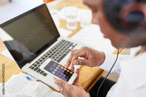 Business Mann mit Kassenzettel bei Buchhaltung im Home Office