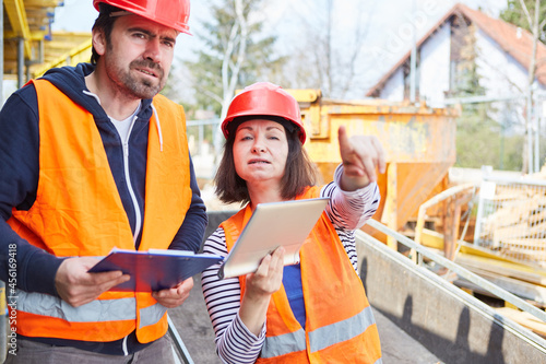 Polier und Architektin mit Computer vor dem Rohbau