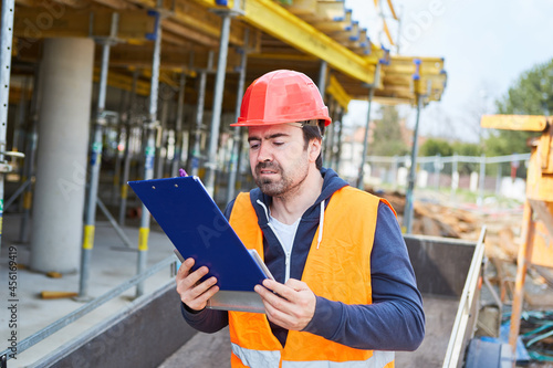Vorarbeiter mit einem Prüfprotokoll auf der Baustelle