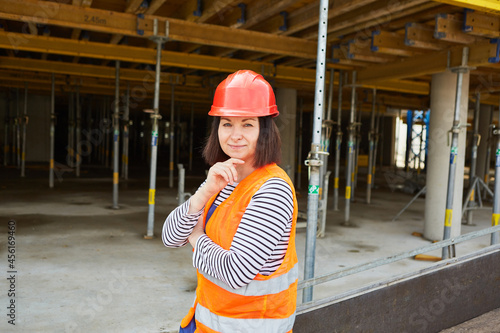 Frau mit Schutzhelm als Lehrling auf dem Rohbau