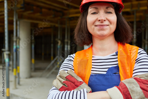 Frau mit Schutzhelm als Lehrling auf dem Rohbau