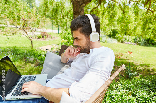 Alleinerziehender Vater am Laptop PC auf der Terrasse