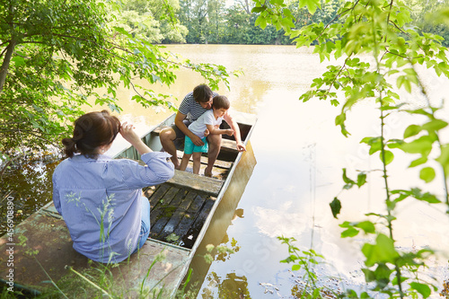 Family with child goes on excursion in a boat on the lake