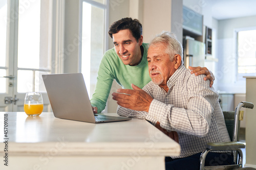 Zufriedener Senior im Rollstuhl betreut vom Sohn