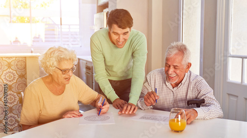 Senior couple and young man solving puzzles