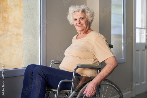 Zufriedene Seniorin im Rollstuhl liest in einem Buch