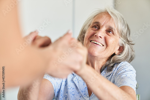 Elderly woman gratefully holds the hands of a geriatric nurse