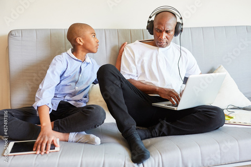 Vater und Sohn auf dem Sofa am Laptop PC im Home Office