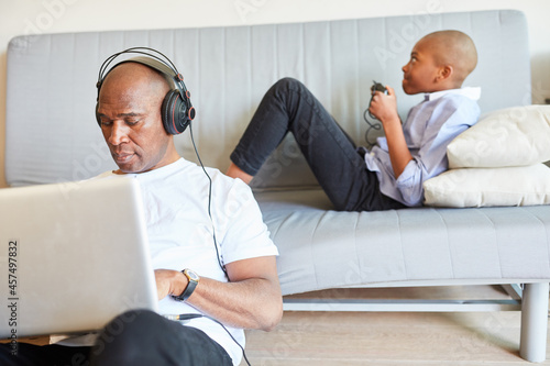 Mann bei Videokonferenz und Kind auf Sofa beim Videospiel