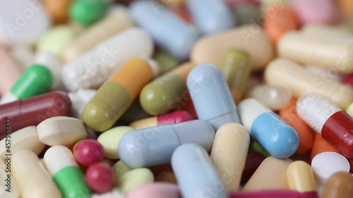 Closeup of pile of pills in blisters rotating counterclockwise in a loop