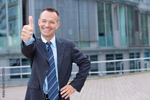 Lächelnder Geschäftsmann lehnt an imaginärer Wand