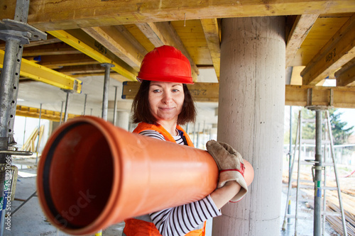 Frau als Handwerker trägt ein Wasserrohr aus Plastik