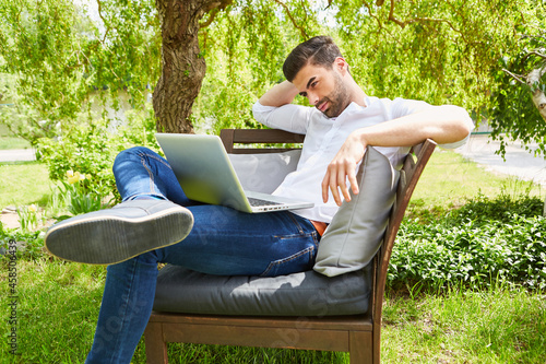 Frau telefoniert mit dem Handy im Garten im Sommer