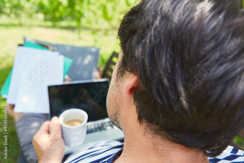 Alleinerziehender Vater am Laptop PC auf der Terrasse
