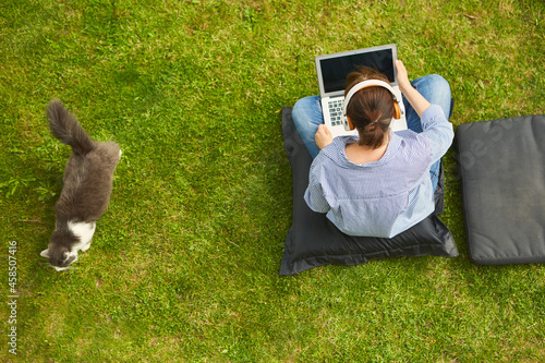 Woman with laptop computer and cat from above in the garden