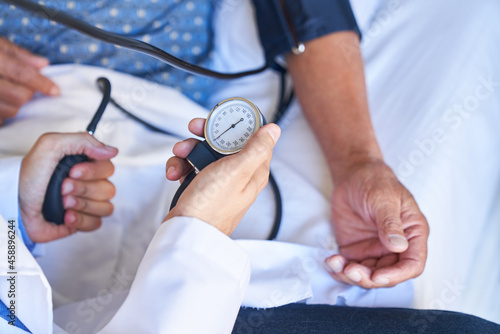Hand von Arzt hält Blutdruckmessgerät beim Blutdruck messen
