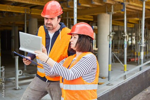 Architektin diskutiert Bauprojekt mit Vorarbeiter