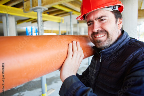 Arbeiter auf Baustelle im Rohbau trägt ein Abflussrohr