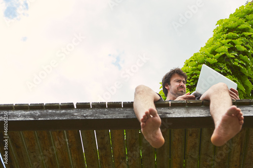 Man as a freelancer on the lawn in the garden with laptop