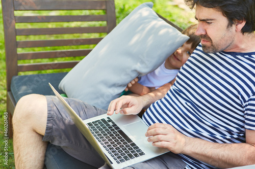 Alleinerziehender Vater am Laptop PC auf der Terrasse
