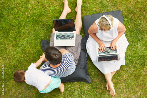 Neugieriges Kind und Eltern am Laptop auf dem Rasen