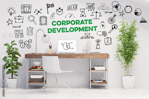 Arbeitsplatz mit Schriftzug Unternehmensentwicklung