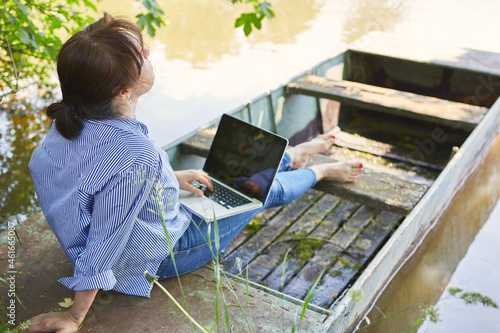 Woman with laptop sits dreamily on the lakeshore on vacation