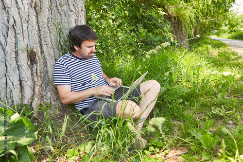 Freiberufler mit Laptop Computer bei Entspannung in Natur