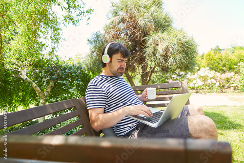 Mann arbeitet am Laptop im Sommer Urlaub am See