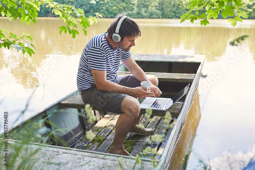 Freiberufler mit Laptop PC sitzt auf einem alten Boot