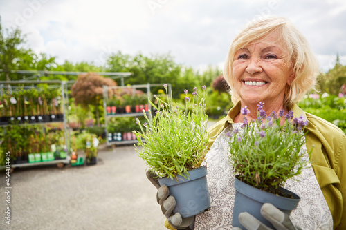 Zufriedene Seniorin als Floristin mit Blumen in Gärtnerei