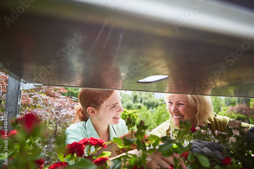 Young florist and experienced gardener in the garden center