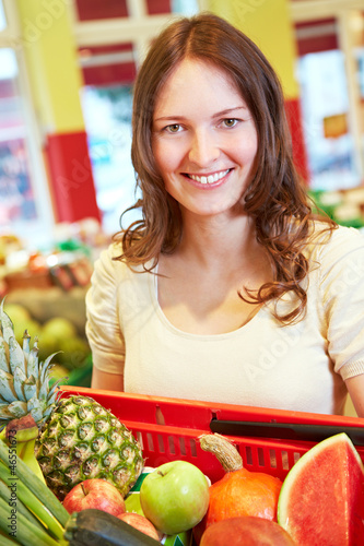 Frau trägt Einkaufskorb voll Gemüse
